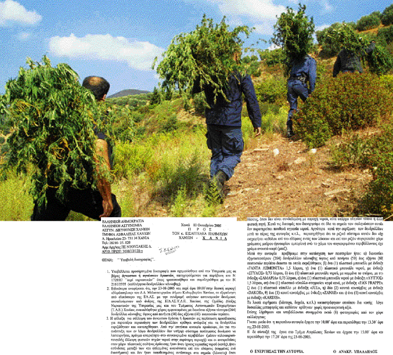 Στις 3 Οκτωβρίου 2005 το Τμήμα Ασφαλείας Χανίων συνέταξε έγγραφο σχετικά με την ανεύρεση της χασισοφυτείας. Και εκεί άρχισαν να διατυπώνονται οι πρώτες απορίες για την περίεργη αυτή καλλιέργεια…