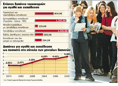 Ιλιγγιώδης είναι όμως και η αύξηση των ποσών που ξοδεύουν τα ελληνικά νοικοκυριά στην εκπαίδευση κατά τα τελευταία χρόνια. Το ποσοστό των δαπανών των νοικοκυριών για αγαθά και υπηρεσίες εκπαίδευσης (ως προς το σύνολο των μηνιαίων δαπανών) το χρονικό διάστημα 1982-1994 παρουσιάζει συνεχή αύξηση, συνολικά 82%, και έχει σχέση με τη σχετική αύξηση του διαθεσίμου εισοδήματος. Τη χρονική περίοδο 19992004 η αύξηση ήταν 15,4% και οι ερευνητές την αποδίδουν στην αλλαγή του συστήματος πρόσβασης στην τριτοβάθμια εκπαίδευση και στην αντίστοιχη αύξηση του αριθμού των μαθητών της Β΄ και Γ΄ Λυκείου που παρακολούθησαν φροντιστηριακά μαθήματα για να ανταποκριθούν στις απαιτήσεις των πανελλαδικών εξετάσεων.