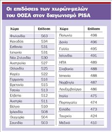 Στο άλλο άκρο της πυραμίδας, η Φινλανδία για μία ακόμη φορά έρχεται πρώτη, βελτιώνοντας μάλιστα ουσιαστικά (15 ολόκληρες μονάδες) την ήδη καλή επίδοσή της και απέχοντας 21 μονάδες από την επόμενη χώρα που είναι το Χονγκ Κονγκ. Το ενδιαφέρον με τη Φινλανδία δεν είναι τόσο το ότι βρίσκεται στην κορυφή μιας κατάταξης που κατασκευάζεται με άξονα τις επιστημονικές γνώσεις, αλλά ότι έχει εξαιρετικά καλές επιδόσεις με σχετικά μικρές αποκλίσεις μεταξύ των μαθητών της: ελάχιστοι είναι οι μικροί Φινλανδοί που δεν τα πάνε καλά. Σύμφωνα με ειδικούς σε θέματα Παιδείας, αυτό μοιάζει να συνδέεται με το γεγονός ότι η Φινλανδία «ταυτόχρονα έρχεται πρώτη στις κατατάξεις της διεθνούς ανταγωνιστικότητας και της καλύτερης αντίληψης για την κοινωνική διαφθορά». Ο κεντρικός κορμός της Ευρώπης (Γαλλία, Γερμανία, Βρετανία) βρίσκεται πάνω από τον μέσον όρο του ΟΟΣΑ και, παρ΄ ότι καταγράφει σημαντικές αυξομειώσεις (-16 η Γαλλία, +14 η Γερμανία) τείνει να συγκλίνει προς αυτόν. Η Ιαπωνία και οι ΗΠΑ κατέγραψαν μειώσεις αλλά ενώ η πρώτη βρίσκεται πάνω από τον μέσον όρο, οι ΗΠΑ βρίσκονται πιο κάτω από αυτόν. Το πρόγραμμα ΡΙSΑ (Διεθνές Πρόγραμμα Αποτίμησης των Μαθητών) είναι μια ποιοτική έρευνα που έχει ξεκινήσει ο ΟΟΣΑ την τελευταία δεκαετία για να μελετήσει όχι τόσο αυτό καθεαυτό το εκπαιδευτικό σύστημα όσο το πώς αυτό μεταφράζεται σε ικανότητες όσον αφορά τους 15χρονους μαθητές. Η έρευνα διεξήχθη σε 57 χώρες και σε δείγμα 400.000 μαθητών. Σημειώνεται πάντως ότι τα στοιχεία δεν είναι πάντοτε συγκρίσιμα με εκείνα του 2003, καθώς ορισμένες χώρες είτε δε συμμετείχαν τότε είτε δε συμμετέχουν τώρα, ενώ διαφορετικός είναι και ο προσανατολισμός των δύο ερευνών.