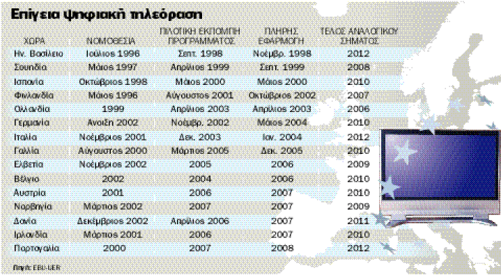 Η συντεταγμένη πορεία που επέλεξαν οι άλλες ευρωπαϊκές χώρες προκύπτει και από τα στοιχεία της γνωστής EBU (ή Eurovision ), τα οποία παρουσιάστηκαν (από τον επικεφαλής της υπηρεσίας Στρατηγικής Πληροφόρησης του φορέα κ. Α. l. Shulzycki ) την περασμένη εβδομάδα σε ημερίδα για την επίγεια ψηφιακή τηλεόραση, που διοργάνωσε το Ινστιτούτο Οπτικοακουστικών Μέσων (ΙΟΜ).