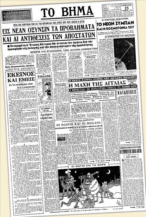 Οι ισχυρές λαϊκές αντιδράσεις προκαλούν σοβαρά προβλήματα στην κυβέρνηση των αποστατών. Τα Χριστούγεννα επισκιάζονται από την οξύτητα της κρίσης, τις δριμύτατες πολιτικές εξελίξεις, αλλά και τον σκοτεινό ρόλο των ανακτόρων. Το νέο έτος θα φέρει μη αναστρέψιμες και καθοριστικές ανακατατάξεις στο πολιτικό τοπίο. « Θα αποδειχθή μοιραία διά την χώραν η “κυβέρνησις” των αποστατών » παρατηρεί σχεδόν προφητικά το πρωτοσέλιδο κύριο άρθρο της εφημερίδας «Το Βήμα» με τίτλο «Κατάπτωσις». Στο ρεπορτάζ που αφορά τις πολιτικές εξελίξεις αναφέρεται, μεταξύ άλλων, ότι « η Ενωσις Κέντρου,διατηρούσα την πλέον συμπαγή πλειοψηφίαν βουλευτών και στηριζόμενη εις την μεγάλην πλειοψηφίαν του ελληνικού λαού,εξακολουθεί να πιστεύη ότι η μόνη διέξοδος εκ της πολιτικής κρίσεως είναι οι εκλογές ». Στο κλίμα των ημερών ανταποκρίνεται η επιφυλλίδα του Ευάγγελου Παπανούτσου, σύμφωνα με την οποία οι άν θρωποι δεν καταλαβαίνουμε τον Χριστό « όχι γιατί δεν μπορούμε αλλά γιατί δεν θέλομε ». Η πρώτη σελίδα της εφημερίδας φιλοξενεί ρεπορτάζ από τη Νέα Υόρκη σχετικά με τις τελευταίες ανακαλύψεις για το Σύμπαν. Σύμφωνα με το ρεπορτάζ « η σπουδαιότερη ίσως ανακάλυψις είναι οι “κβάσαρς”- συντομογραφία των αστρικών πηγών ραδιοκυμάτων- τα λαμπρότερα και μακρυνότερα ουράνια σώματα που παρετηρήθησαν ποτέ ». Σε αποκλειστική συνεργασία με το «Ρaris Μatch» η εφημερίδα «Το Βήμα» προσφέρει και την 23η συνέχεια της «Μάχης της Αγγλίας», από το έργο που έγραψε ο γάλλος δημοσιογράφος Ρεϊμόν Καρτιέ για τον Β΄ Παγκόσμιο Πόλεμο. « Καλά που είναι κι αυτός ο Χριστιανός,ο Πατριάρχης Αθηναγόρας,για να μας θυμίζη ότι Χριστούγεννα δεν είναι μόνο χριστόψωμο,γαλοπούλα και ρεβεγιόν,αλλά και προσκύνημα στο λίκνο της Ειρήνης » αναφέρεται σε χρονογράφημα με τίτλο «Δρόμοι ειρήνης» του Π. Παλαιολόγου.