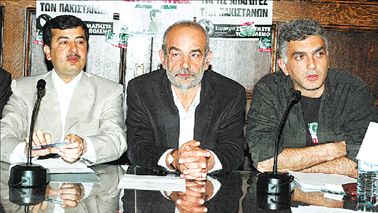 Ο προέδρος της Πακιστανικής Κοινότητας στην Ελλάδα κ. Τζαβέντ Ασλάμ, ο πρόεδρος του Συνασπισμού κ. Αλ. Αλαβάνος και ο συντονιστής της συμμαχίας «Σταματήστε τον Πόλεμο» κ. Ι. Σηφακάκης