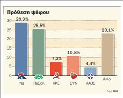 Διαφορά 3,4% ανάμεσα στη Νέα Δημοκρατία και στο ΠαΣοΚ παρουσιάζει δημοσκόπηση της ΜRΒ που έγινε για λογαριασμό του τηλεοπτικού σταθμού Αlpha. Στη δημοσκόπηση που διεξήχθη μετά την εκλογή του κ. Αλ. Τσίπρα στην προεδρία του ΣΥΝ, εμφανίζει τον ΣΥΡΙΖΑ στην τρίτη θέση. Συγκεκριμένα, στην πρόθεση ψήφου η ΝΔ συγκεντρώνει 28,9% έναντι 25,5% του ΠαΣοΚ, ο ΣΥΡΙΖΑ 10,8%, το ΚΚΕ 7,3% και ο ΛΑΟΣ 4,4%. Πρόκειται για άλλη μία δημοσκόπηση που δείχνει άνοδο των μικρών κομμάτων σε βάρος των μικρών. Βάσει των ποσοστών αυτών οι έδρες στη Βουλή θα ήταν: ΝΔ από 141 ως 145, ΠαΣοΚ από 91 ως 96, ΣΥΡΙΖΑ από 28 ως 32, ΚΚΕ από 20 ως 23 και ΛΑΟΣ από 11 ως 13.