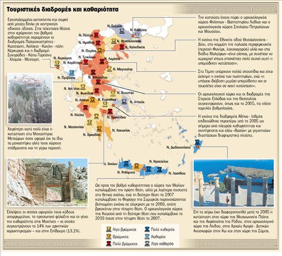Οσον αφορά την εικόνα των αρχαιολογικών χώρων και διαδρομών του «κλασικού γύρου», που περιλαμβάνει 18 διαδρομές (ΑθήναΙσθμός- Επίδαυρος- Μυκήνες- Ναύπλιο- Τρίπολη- Σπάρτη- Καλαμάτα – Ολυμπία- Πάτρα- Ρίο- ΑντίρριοΔελφοί) και τους αρχαιολογικούς χώρους των Μυκηνών, της Επιδαύρου, του Μυστρά, της Ολυμπίας, των Δελφών και των Μετεώρων, αποτυπώθηκε δυσμενέστερη εικόνα κατά το 2007 απ΄ ό,τι το 2005 αφού οι αρνητικές τοποθετήσεις των ξεναγών συγκεντρώνουν ποσοστό 34,6% («βρώμικοι» και «πολύ βρώμικοι» χώροι) έναντι 32,9% το 2005… Κατά την έρευνα του 2007 μόνο ο αρχαιολογικός χώρος των Δελφών και ο Μυστράς αξιολογούνται θετικότερα απ΄ ό,τι πριν, χειρότερη αναδεικνύεται η εικόνα των Μετεώρων και της Επιδαύρου, ενώ δεν παρατηρείται μεταβολή όσον αφορά τον αρχαιολογικό χώρο της Ολυμπίας. Χειροτερεύει η εικόνα του πελοποννησιακού οδικού δικτύου (π.χ. Ναύπλιο- Τρίπολη- Σπάρτη, Ολυμπία- ΠάτραΡίο, Ισθμός- Μυκήνες, Ισθμός- Επίδαυρος).