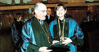 Ο Ιρβιν Γιάλομ με τη Φωτεινή Τσαλίκογλου κατά την τελετή αναγόρευσής του επιτίμου διδάκτορος του Παντείου Πανεπιστημίου τον Μάιο του 2005