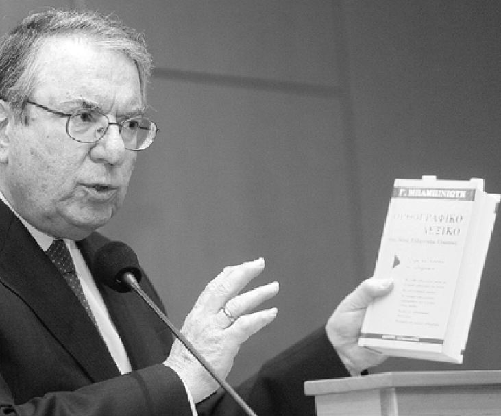 Εμαθε τον κόσμο τι θα πει «λεξικό» και συνέδεσε το όνομά του με τη γλώσσα. Το «Λεξικό Μπαμπινιώτη» δεν έχει απλώς καθιερωθεί ως ένα εργαλείο για τη χρήση της γλώσσας αλλά και ως ένα βιβλίο που διαβάζεται, αφού για πρώτη φορά μπήκαν σχόλια σε λεξικό, δηλαδή πληροφορίες που μπορούμε να πούμε ότι λειτουργούν ως αφηγηματικά στοιχεία. Την περασμένη Δευτέρα ο Γ. Μπαμπινιώτης παρουσίασε ένα καινούργιο λεξικό, το Ορθογραφικό Λεξικό της Νέας Ελληνικής Γλώσσας, με πλούσιο λημματολόγιο και επιπλέον 3.500 ορθογραφικά σχόλια, που εξηγούν και διδάσκουν την ορθογραφία. Αυτή η νέα έκδοση του Κέντρου Λεξικολογίας είναι η αφορμή της συνέντευξης. Συναντηθήκαμε με τον Γ. Μπαμπινιώτη στα γραφεία της Φιλεκπαιδευτικής Εταιρείας, στο Παλαιό Ψυχικό, ένα ιστορικό κτίριο που υπήρξε η κατοικία του πρωθυπουργού Ανδρέα Μιχαλακόπουλου και αργότερα της πριγκίπισσας Ελένης.