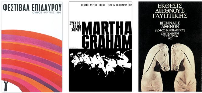 Αριστερά, αφίσα του Φρέντυ Κάραμποττ για τον ΕΟΤ (1963). Επάνω, αφίσα των Μιχάλη και Λουκίας Κατζουράκη για τη διαρκή έκθεση στο Παγκόσμιο Κέντρο Ειρήνης, Ελευθεριών και Ανθρωπίνων Δικαιωμάτων στο Βερντέν της Γαλλίας (1994)