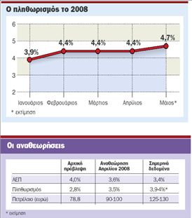 Ο πληθωρισμός είναι πλέον ανεξέλεγκτος και πλησιάζει μήνα με τον μήνα στο 5%. Ξεκίνησε από το 3,9% τον Ιανουάριο του 2008, ανέβηκε στο 4,4% τον Φεβρουάριο, ποσοστό στο οποίο έχει παραμείνει από τότε ως και τον Απρίλιο. Για τον Μάιο όμως οι εκτιμήσεις δείχνουν ότι θα ξεπεράσει το 4,6%, γεγονός το οποίο σημαίνει ότι στο πρώτο πεντάμηνο του έτους ο πληθωρισμός κατά μέσον όρο κινείται στο 4,3% με 4,4%. Η πρόβλεψη του υπουργείου Οικονομίας για το σύνολο του έτους αναθεωρήθηκε και για τον πληθωρισμό και από 2,8% που ήταν τον περυσινό Δεκέμβριο, ανέβηκε στο 3,5% τον Απρίλιο του 2008.