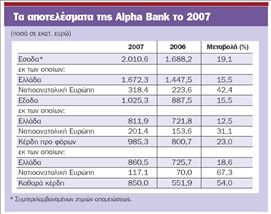 Aύξηση της καθαρής κερδοφορίας της κατά 54% στα 850 εκατ. ευρώ πέτυχε ο όμιλος της Αlpha Βank το 2007, το ΔΣ της οποίας θα προτείνει στη γενική συνέλευση των μετόχων της τη διανομή μερίσματος 0,90 ευρώ ανά μετοχή, το οποίο είναι αυξημένο κατά 20% σε σχέση με την προηγούμενη χρήση. Τα αποτελέσματα που ανακοινώθηκαν χθες, στα οποία αποτυπώνεται η αυξανόμενη συμμετοχή των κερδών από τις δραστηριότητες της ΝΑ Ευρώπης στη συνολική κερδοφορία του ομίλου, δείχνουν ότι η Αlpha βρίσκεται σε πορεία επίτευξης των στόχων του επιχειρησιακού της σχεδίου ως και το 2010.