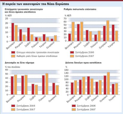 Πέρασε και δεν ακούμπησε η πιστωτική κρίση τις αναδυόμενες οικονομίες της Νοτιοανατολικής Ευρώπης. Οπως επισημαίνεται από τη Διεύθυνση Οικονομικών Μελετών και Προβλέψεων της Εurobank ΕFG στο τελευταίο τεύχος της έκδοσης «Νew Εurope», οι οικονομίες των χωρών της Νέας Ευρώπης δεν αντιμετώπισαν σημαντικά προβλήματα στη διεθνή χρηματοοικονομική κρίση που προκλήθηκε από τα προβλήματα στεγαστικής πίστης στις ΗΠΑ. Συγκεκριμένα, οι ρυθμοί ανάπτυξης των οικονομιών αναμένεται να είναι ισχυροί, πλην όμως θα επιβραδυνθούν ελαφρά το 2008.