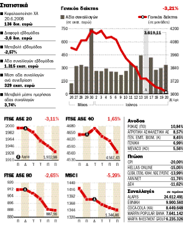 Πτωτικά κινήθηκε και στις τέσσερις συνεδριάσεις της εβδομάδας ο γενικός δείκτης τιμών του Χρηματιστηρίου Αθηνών, για να διαμορφωθεί στο κλείσιμο της Παρασκευής στο επίπεδο των 3.619 μονάδων, παρουσιάζοντας απώλειες περίπου 121 μονάδων σε σχέση με την προηγούμενη εβδομάδα (πτώση 3,2%).