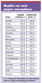 Στην κορυφή της κατάταξης στην ευρωζώνη έρχεται η Ελλάδα σε ό,τι αφορά τις μικρές επιχειρήσεις οι οποίες λειτουργούν σε αυτήν και τον αριθμό των εργαζομένων τους. Αυτό δείχνει η έκθεση για τις «Βιομηχανικές σχέσεις στην ΕΕ,την Ιαπωνία,τις ΗΠΑ και τις άλλες παγκοσμιοποιημένες οικονομίες,2005 – 2006» του Ευρωπαϊκού Ινστιτούτου για τις Συνθήκες Ζωής και Εργασίας, η οποία είναι αφιερωμένη ειδικότερα στην «Προσαρμοστικότητα σε παγκοσμιοποιημένο περιβάλλον:οι οργανισμοί προσωρινής απασχόλησης και οι μικρομεσαίες επιχειρήσεις». Οι πολύ μικρές επιχειρήσεις (κάτω των 10 ατόμων) αποτελούν υποπερίπτωση της γενικότερης κατηγορίας των μικρομεσαίων επιχειρήσεων, οι οποίες ανάλογα με τη χώρα μπορεί να αφορούν ως και επιχειρήσεις που απασχολούν ως 250 άτομα. Στο σύνολό τους όμως- είτε εξαιρετικά μικρές, είτε μεσαίες, είτε μεγαλύτερες- έχουν ειδική σημασία για τους εργαζομένους και την οικονομία, καθώς είναι η συντριπτικά κυρίαρχη οργανωτική μορφή, αποτελώντας παντού το 98- 99% των επιχειρήσεων όπου απασχολείται, επίσης παντού, πάνω από το 50% της εργατικής δύναμης.