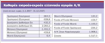 Με μικρή μείωση ενεργητικού, με καθαρές εκροές 1,5 δισ. ευρώ, αλλά και με ικανοποιητικές αποδόσεις τουλάχιστον στα μετοχικά αμοιβαία, έκλεισε το 2007 για την αγορά των αμοιβαίων κεφαλαίων στο σύνολό της.