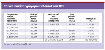 Οι συνδρομητές της ταχύτητας των 768 Κbps που πλήρωναν 18,50 ευρώ τον μήνα περνούν αυτόματα και δωρεάν στην ταχύτητα 1 Μbps με χρέωση 16,50 ευρώ τον μήνα. Οι χρήστες της γραμμής 1 Μbps από 21,50 ευρώ μηνιαίως πληρώνουν, πλέον, επίσης 16,50 ευρώ τον μήνα από 21,50 ευρώ. Οι συνδρομητές της ταχύτητας των 2 Μbps από 29,50 ευρώ μηνιαίως χρεώνονται πλέον με 19,50 ευρώ, οι συνδρομητές της ταχύτητας των 4 Μbps χρεώνονται με 22,5 ευρώ έναντι 38,5 ευρώ και οι συνδρομητές της ταχύτητας 8 Μbps χρεώνονται με 26,90 έναντι 48,50 ευρώ που ίσχυε. Ταυτόχρονα ο ΟΤΕ ανακοινώνει τη διάθεση μιας νέας, ακόμη μεγαλύτερης ταχύτητας ως 24 Μbps, στην τιμή των 29,9 ευρώ μηνιαίως.