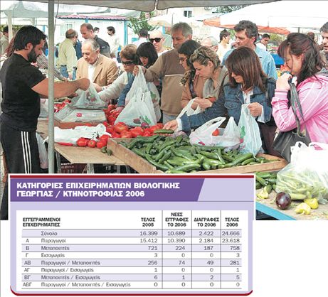 Στη χώρα μας οι καταναλωτές που τα επιλέγουν για το τραπέζι τους πληθαίνουν όπως και οι παραγωγοί που στρέφονται στη βιολογική γεωργία και κτηνοτροφία. Η αγορά βιολογικών προϊόντων στη χώρα μας αυξάνεται με μέσο ετήσιο ρυθμό 30%. Σύμφωνα με τα τελευταία στοιχεία του υπουργείου Αγροτικής Ανάπτυξης και Τροφίμων, το 2006 στον κλάδο μπήκαν περισσότεροι από 10.000 επιχειρηματίες. Σήμερα το σύνολο των καλλιεργούμενων εκτάσεων (μαζί με τους βιολογικούς βοσκοτόπους) ξεπερνά τα 3 εκατομμύρια στρέμματα- 4,48% των καλλιεργούμενων εκτάσεων. Το ποσοστό αυτό διαφοροποιείται αν υπολογίσουμε μόνο τις εκτάσεις που καλλιεργούνται – μόλις που φθάνει το 3% και μας κατατάσσει στις τελευταίες θέσεις ανάμεσα στις χώρες της Ευρωπαϊκής Ενωσης. Οι βιολογικές εκτροφές είναι λιγότερο ανεπτυγμένες από τις βιολογικές καλλιέργειες, παρ΄ ότι σύμφωνα με τους ειδικούς η ελληνική κτηνοτροφία- ιδιαίτερα των αιγοπροβάτων- δεν είναι εντατική και είναι πολύ εύκολο να μετατραπεί σε βιολογική. Πάντως υπάρχουν και καταγγελίες, όπως αυτή του ΣΥΡΙΖΑ στη Βουλή, για «το φαινόμενο τής με ρουσφετολογικό τρόπο αθρόας ένταξης καλλιεργητών στα συστήματα παραγωγής βιολογικών προϊόντων, με κύριο σκοπό την είσπραξη των επιδοτήσεων». Το ζήτημα της διατροφικής αξίας των βιολογικών σε σχέση με τα συμβατικά τίθεται συχνά τα τελευταία χρόνια στο μικροσκόπιο των ερευνητών. Είναι χαρακτηριστικό ότι ο συντονιστής του ευρωπαϊκού προγράμματος QLΙF καθηγητής κ. Κάρλο Λέιφερτ εξαίρει τα βιολογικά σημειώνοντας ότι όσοι δεν καταναλώνουν ημερησίως τις συνιστώμενες πέντε μερίδες φρούτων και λαχανικών μπορούν να αυξήσουν την πρόσληψη θρεπτικών συστατικών με μικρότερη κατανάλωση βιολογικών προϊόντων.
