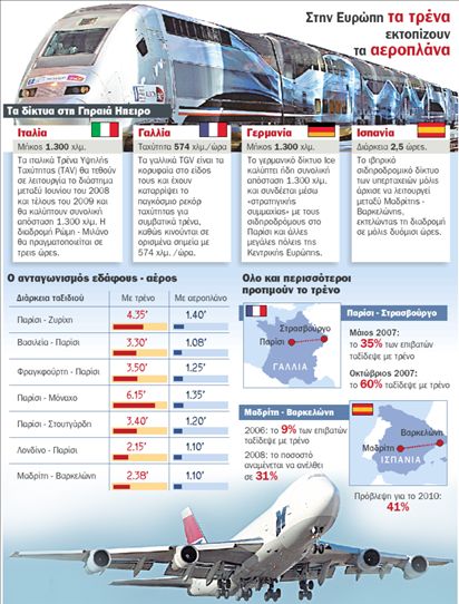ΛΟΝΔΙΝΟ Πονοκέφαλο στις αεροπορικές εταιρείες έχουν προκαλέσει τα τρένα υψηλής ταχύτητας της Ευρώπης τα οποία έχουν μειώσει τις αποστάσεις, με αποτέλεσμα ο σιδηρόδρομος να έχει μετατραπεί σε άκρως ανταγωνιστικό τομέα της οικονομίας, ο οποίος απειλεί να παραγκωνίσει τις αερομεταφορές. Για του λόγου το αληθές, η Αir France ετοιμάζεται να περικόψει 1.000 θέσεις εργασίας ως το 2016, ενώ μείωσε ήδη τις πτήσεις της προς Ρεν, Λυών, Αβινιόν και Στρασβούργο. Τα «φτερωτά τρένα» αποτελούν σήμερα τη μεγαλύτερη πρόκληση για τις αερομεταφορές, καθώς το σιδηροδρομικό δίκτυο που διατρέχει τη Γηραιά Ηπειρο είναι πολύ πυκνό. Συχνά αποτελείται από τρένα τα οποία αναπτύσσουν ιλιγγιώδεις ταχύτητες και καλύπτουν μεγάλες αποστάσεις σε μόλις λίγες ώρες.