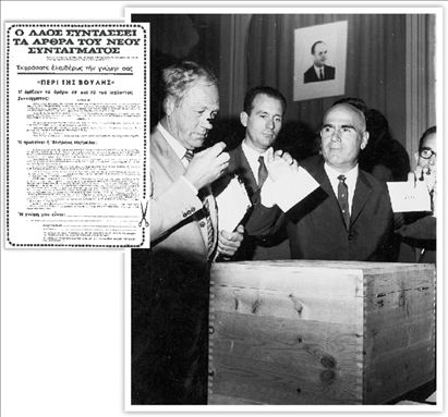 Γιατί να μην πανηγυρίζουν; Οι Ελληνες δεν είχαν «αποθεραπευτεί» από την «αρρώστια της πολιτικής» και «γυψωμένοι» από τη χούντα «έβλεπαν» μόνο το ψηφοδέλτιο με το «Ναι» πριν πάνε στην κάλπη… Στο 92,2% το ποσοστό του «Ναι»! Επρόκειτο για δημοψήφισμα με στρατιωτικό νόμο και στρατευμένους επόπτες, υπό την εποπτεία αξιωματικών με στολή εκστρατείας. Τα ψηφοδέλτια με το «Οχι» είχαν τοποθετηθεί σε αρκετή απόσταση από τα αντίστοιχα του «Ναι», ώστε να μη «διαφεύγει την καταγραφή» όποιος τολμούσε να τα «πλησιάσει». Πάνω από ένα εκατομμύριο ψηφοφόροι απείχαν, παρά τις εξοντωτικές ποινές που προβλέπονταν για την αποχή και οι οποίες εφαρμόστηκαν σε πολλούς.