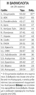 Α΄ ΕΘΝΙΚΗ (29η αγωνιστική) Τα αποτελέσματα: Ξάνθη- Ολυμπιακός 1-4 (53΄ Λαμπριάκος – 30΄ Ζεβλάκοφ, 38΄, 49΄, 52 ΄ Τζόρτζεβιτς ), ΠΑΟΚ- ΑΕΚ 0-4 (20΄ Παπασταθόπουλος , 23΄ Μπλάνκο, 25΄ Λυμπερόπουλος, 82΄ Καλόν ), Παναθηναϊκός- Αρης 1-0 (74΄ Καραγκούνης ), Αστέρας ΤρίποληςΛεβαδειακός 1-2 (89΄ Μασάντο 5΄ Φυτανίδης αυτ., 90