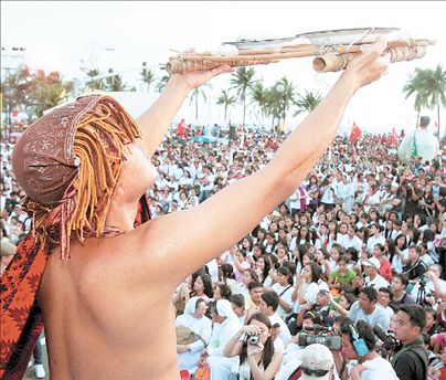 Φιλιππινέζοι φοιτητές, καλλιτέχνες και ακτιβιστές που ανήκουν σε διάφορες εθνικές και θρησκευτικές μειονότητες διαδηλώνουν σε πάρκο της πρωτεύουσας, Μανίλα. Οι διαδηλωτές διοργάνωσαν το αποκαλούμενο «Φεστιβάλ Αλήθειας» για να διαμαρτυρηθούν για τις «αναλήθειες» της κυβέρνησης της Γκλόρια Αρόγιο