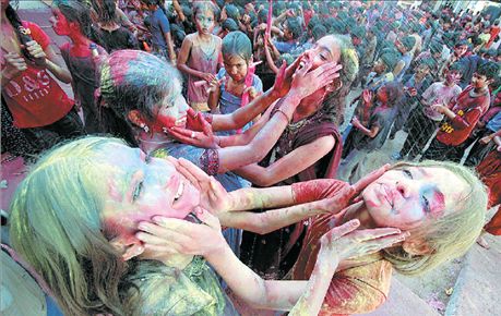 Μαθήτριες που γιορτάζουν τον ερχομό της άνοιξης παίζουν, αλείφοντας με νερομπογιές η μία την άλλη στο Αχμανταμπάντ της Ινδίας. Οι εκδηλώσεις για το Χόλι, την γιορτή των χρωμάτων, κορυφώνονται σήμερα. Ακτιβιστές προειδοποιούν όμως για χιλιάδες θανάτους που σημειώνονται στη διάρκεια της γιορτής σε τροχαία δυστυχήματα τα οποία οφείλονται στην υπερβολική κατανάλωση αλκοόλ. Συνήθως, αυτές τις ημέρες καταναλώνεται άφθονο αλκοόλ, κυρίως μείγμα αμυγδάλων, μπαχαρικών, γάλακτος και ζάχαρης με «μπανγκ», μεθυστική ουσία που εξάγεται από τα φύλλα της κάνναβης.
