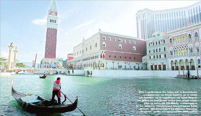 Και όχι μόνον αυτό. Πρόκειται για πιστή αναπαράσταση της «καρδιάς» της Βενετίας, με το Κανάλ Γκράντε, το παλάτι των δόγηδων, το καμπαναριό του Αγίου Μάρκου, με τρία εσωτερικά κανάλια που αντηχούν από τα τραγούδια των… κινέζων γονδολιέρηδων. Η αντίστοιχη αναπαράσταση της Βενετίας στο Λας Βέγκας των Ηνωμένων Πολιτειών έχει να επιδείξει μόνον ένα κανάλι. Οντως, ο νέος ναός των τυχερών παιγνίων του Μακάο είναι τριπλάσιος σε μέγεθος από το μεγαλύτερο καζίνο του Λας Βέγκας και στεγάζει χιλιάδες «κουλοχέρηδες», τραπέζια για μπακαρά, σεμέν ντε φερ και ό,τι μπορεί να βάλει το μυαλό του ανθρώπου.