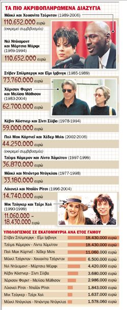 Μεγάλα διαζύγια γνωστών ζευγαριών κοστίζουν όσο μια περιουσία κανονικού ανθρώπου και πληρώνονται «χρυσά». Απόδειξη, ο κατάλογος που δημοσιεύεται στο έγκυρο περιοδικό «Forbes», όπου φαίνονται όχι τα ζευγάρια που παντρεύονται αλλά τα ζευγάρια που χωρίζουν, καθώς και πόσο το… πληρώνουν.