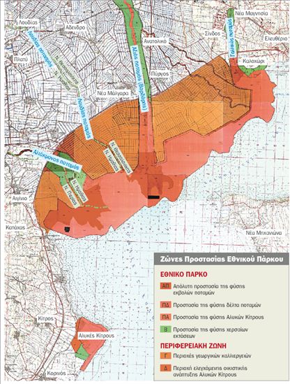 – Περιοχή Προστασίας της Φύσης (ΠΔ-ΠΑ-Β): Αποτελείται από το Δέλτα των ποταμών, την Αλυκή Κίτρους και χερσαίες εκτάσεις. Επιτρέπονται: αμμοληψία, οστρακοκαλλιέργεια, παραγωγή άλατος στην έκταση της εταιρείας Ελληνικές Αλυκές ΑΕ.