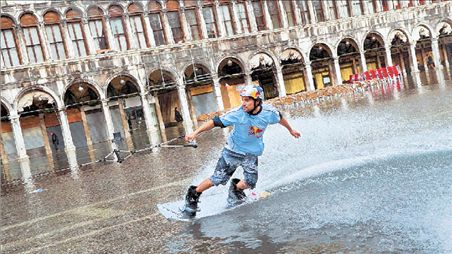 Μετά τις γόνδολες, ευτυχισμένος θαλάσσιος σκιέρ γλιστρά άνετα επάνω στην πλημμυρισμένη πλατεία του Αγίου Μάρκου, κατά μήκος της μεγάλης στοάς στο Παλάτι των Δόγηδων της Βενετίας. Εφέτος η στάθμη της βενετσιάνικης λιμνοθάλασσας έφθασε στο 1,56 μ. επάνω από τη μέση στάθμη της θάλασσας, χωρίς ωστόσο να σπάσει το απόλυτο ρεκόρ των 194 εκατοστών όπου είχε φθάσει στις 4 Νοεμβρίου 1966.