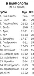 Κέρκυρα 22, Καλαμαριά 20, Πιερικός 19, Βέροια 19, Διαγόρας 15, Καλαμάτα 15, Εθνικός 15, Καλλιθέα 13, Αγρ. Αστέρας 11, Ηλυσιακός 11, Αναγ. Καρδίτσας 10, Εθν. Αστέρας 9, Καστοριά 7. * Ο κ. Βίκτωρας Μητρόπουλος με επιστολή του προς το ΔΣ της ΕΠΟ γνωστοποίησε χθες ότι στις εκλογές της 24ης Ιανουαρίου θα είναι υποψήφιος για τη θέση του προέδρου, αλλά και για εκείνη του εκπροσώπου στην Ελληνική Ολυμπιακή Επιτροπή.