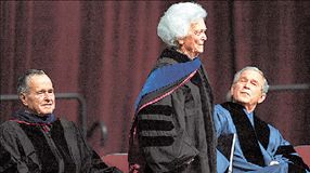 ΕΝΑΣ ΝΥΝ και ένας πρώην πρόεδρος των Ηνωμένων Πολιτειών επιδοκιμάζουν μια πρώην πρώτη κυρία που τυχαίνει να είναι μητέρα του πρώτου και σύζυγος του δεύτερου. Το στιγμιότυπο είναι από την τελετή απονομής των πτυχίων στο Πανεπιστήμιο Α&Μ του Τέξας, όπου η Μπάρμπαρα Μπους ήταν το τιμώμενο πρόσωπο και η βασική ομιλήτρια.