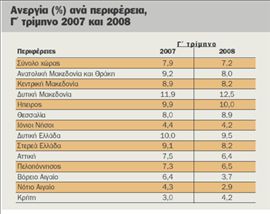 Κατά τα άλλα, η ΕΣΥΕ ανακοίνωσε ότι η ανεργία σημείωσε το γ΄ τρίμηνο του 2008 νέα μείωση στο 7,2% από 7,9% που ήταν το ίδιο τρίμηνο του 2007. Το ποσοστό ανεργίας αντιστοιχεί σε 355.145 άτομα. Η ανεργία πλήττει και πάλι κυρίως τις γυναίκες, σε ποσοστό 10,8%, και λιγότερο τους άνδρες, σε ποσοστό 4,7%. Η συνολική ανεργία μπορεί να καταγράφεται στο 7,2%, αλλά στις ηλικίες μεταξύ 15 ως 29 ετών η ανεργία φθάνει το 15,6%, ενώ ειδικά στις ηλικίες 15-24 ετών προσεγγίζει το 25%. Σε ό,τι αφορά την ανεργία ανά περιφέρεια η εικόνα παρουσιάζεται ως εξής: