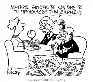 Κάπως έτσι η χώρα βρίσκεται αντιμέτωπη με συνδυασμένη και ταυτόχρονα εξελισσόμενη κοινωνική, οικονομική και πολιτική κρίση. Η οικονομία απειλείται με ύφεση, το κράτος κινδυνεύει να μείνει από λεφτά, οι τράπεζες στηρίζονται στην κρατική βοήθεια, οι επιχειρήσεις φυτοζωούν, τα κυρίαρχα πρόσωπα είναι απαξιωμένα, το πολιτικό σύστημα κατακερματισμένο, αδύναμο και εξαρτημένο, η κοινωνία οργισμένη και φοβισμένη μαζί, και οι νέοι της στους δρόμους έτοιμοι για συγκρούσεις και αναστατώσεις.