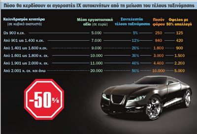 Το τέλος ταξινόμησης οχημάτων υπολογίζεται επί της εργοστασιακής αξίας και οι συντελεστές διαμορφώνονται ανάλογα με τον κυλινδρισμό του κινητήρα. Ετσι, για ένα όχημα με κινητήρα ως 900 κυβικά εκατοστά το τέλος ταξινόμησης είναι 5%. Αυτό σημαίνει ότι αν το μέσο εργοστασιακό κόστος για τη συγκεκριμένη κατηγορία οχημάτων είναι 5.000 ευρώ τότε το όφελος για τον ενδιαφερόμενο αγοραστή είναι μόλις 125 ευρώ. Για οχήματα με κυβισμό από 901 κ.εκ. ως 1.400 κ. εκ. ο συντελεστής ταξινόμησης είναι 12% και με μέσο εργοστασιακό κόστος 7.000 ευρώ το όφελος ανέρχεται σε 420 ευρώ. Περίπου 900 ευρώ θα κερδίσουν όσοι προχωρήσουν τους επόμενους μήνες στην απόκτηση οχημάτων με κινητήρα από 1.401 ως 1.600 κυβικά εκατοστά καθώς η εργοστασιακή αξία διαμορφώνεται σε περίπου 9.000 ευρώ, ενώ 1.500 ευρώ λιγότερα θα πληρώσει κάποιος για την αγορά ενός αυτοκινήτου με κινητήρα από 1.601 ως 1.800 κυβικά εκατοστά. Σαφώς μεγαλύτερο θα είναι το όφελος για εκείνους που θα προχωρήσουν σε αγορά αυτοκινήτων μεγαλύτερου κυβισμού.