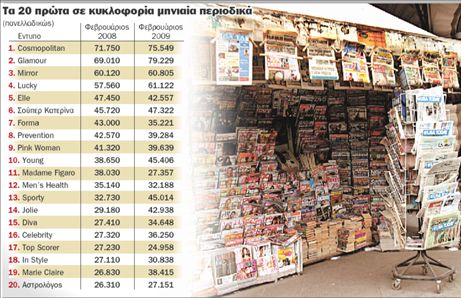 Στον τομέα των γυναικείων περιοδικών τα οποία πολλαπλασιάζονται παραμένει στην κορυφή το «Cosmopolitan», ενώ σταθερή αλλά ιδιαίτερα χαμηλή είναι η πορεία των θεματικών περιοδικών (υγείας και διατροφής, αστρολογίας), με εξαίρεση τα περιοδικά αυτοκινήτου που εξαιτίας της κρίσης στη συγκεκριμένη αγορά κατρακυλούν στον πίνακα των κυκλοφοριών.