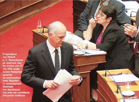 Πριν από λίγοεστάληη επιστολή του κ. Γ. Παπανδρέου προς τη Γενική Γραμματέα του ΚΚΕ κυρία Αλέκα Παπαρήγα. Πρόκειται για την απάντηση του προέδρου του ΠαΣοΚ προς το ΚΚΕ, το οποίο είχε εξοργιστεί από τις δηλώσεις του κ. Θ. Πάγκαλου εναντίον του και ζητούσε από τον κ. Παπανδρέου να πάρει θέση. Νωρίτερα, η κυρία Παπαρήγα, δήλωσε σε συνέντευξη Τύπου ότι «είναι άνευ αξίας πλέον η απάντηση. Θα την αρχειοθετήσουμε».