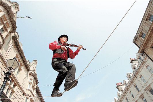 Ο ΙΣΟΡΡΟΠΙΣΤΗΣ ΒΙΟΛΟΝΙΣΤΑΣ Ο βιολονίστας βαρέθηκε στη μια στέγη και είπε να περπατήσει ως την… απέναντι. Για την ποιότητα της δεξιοτεχνίας του ακροβάτη στο βιολί δεν παίρνουμε όρκο- αν και οι θεατές τής εν λόγω ατραξιόν στο περίφημο Φεστιβάλ του Μπράιτον στη Νότια Αγγλία ασφαλώς τη βρήκαν «ισορροπημένη». Το ετήσιο καλλιτεχνικό φεστιβάλ, το οποίο διοργανώνεται ανελλιπώς από το 1966, δεν πτοείται εφέτος από την οικονομική κρίση και πραγματοποιεί δεκάδες εκδηλώσεις οι οποίες συνολικά θα διαρκέσουν σχεδόν έναν μήνα. Οι διοργανωτές του εκτιμούν πως η συνολική προσέλευση θα ξεπεράσει το μισό εκατομμύριο φιλότεχνους. (RΕUΤΕRS/LUΚΕ ΜΑCGRΕGΟR)