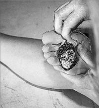 Και ξαφνικά οι τηλεοπτικές εκπομπές έστρεψαν τον καταγγελτικό φακό τους στην Αrt Αthina. Αφορμή, η περιβόητη περφόρμανς του Λάμπρου Στεμνή κατά την οποία ένας άνθρωπος πεσμένος στα γόνατα μαστιγωνόταν και μάτωνε μπροστά στα μάτια των θεατών. Οι κάμερες βέβαια παρέβλεψαν μια άλλου είδους μαζοχιστική περφόρμανς που φιλοξενήθηκε στην ίδια εκδήλωση: η Ευαγγελία Μπασδέκη καθόταν με περισσή υπομονή και στωικότητα και έραβε στην πατούσα της ένα κομμάτι ύφασμα (φωτογραφία). Αρκετοί ήταν εκείνοι που κοντοστάθηκαν προσπαθώντας να καταλάβουν τι ακριβώς έκανε και κυρίως γιατί το έκανε.