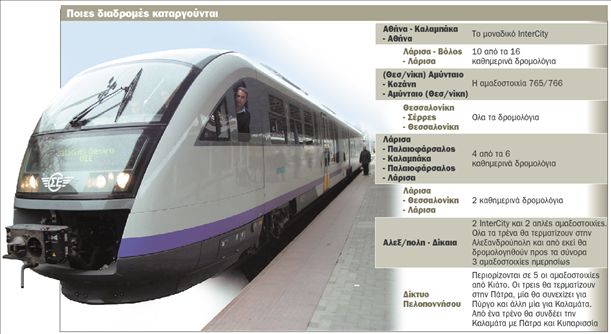 Συγκεκριμένα, αποκόπτεται η Δυτική Θεσσαλία από την υπόλοιπη χώρα, ελαχιστοποιείται η σύνδεση του διπόλου Λάρισας- Βόλου, καταργείται ο Προαστιακός των Σερρών, μειώνονται τα δρομολόγια του Προαστιακού της Θεσσαλονίκης, αποδεκατίζεται ο σιδηρόδρομος της Πελοποννήσου, ενώ όλα τα τρένα προς τον Εβρο θα σταματούν στην Αλεξανδρούπολη, απ΄ όπου το ταξίδι θα συνεχίζεται με τοπικές αμαξοστοιχίες.
