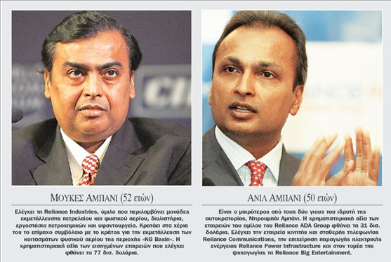 Τα πλουσιότερα αδέλφια της Ασίας, ο Μουκές και ο Ανίλ Αμπάνι, κληρονόμοι του ινδού μεγιστάνα Ντιρουμπάι Αμπάνι, είναι οι πρωταγωνιστές μιας δικαστικής διαμάχης που μονοπωλεί το ενδιαφέρον των ινδικών ΜΜΕ και αφορά την εκμετάλλευση μιας μεγάλης έκτασης με κοιτάσματα φυσικού αερίου. Τα περιουσιακά στοιχεία που κατέχουν τα δύο αδέλφια ισοδυναμούν με το 5% του ΑΕΠ της Ινδίας. Ωστόσο οι μεταξύ τους σχέσεις είναι κάκιστες. Είναι χαρακτηριστικό ότι κατοικούν σε διαφορετικούς ορόφους του ίδιου κτιρίου αλλά δεν ανταλλάσσουν ούτε «καλημέρα». Από την εξέλιξη της περίπλοκης υπόθεσης, στην οποία εμπλέκεται και το κράτος, θα κριθούν πολλά για την πορεία της ινδικής οικονομίας το επόμενο διάστημα.