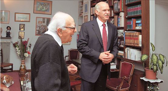 Οχι, η πρωθυπουργική επίσκεψη δεν αφορούσε τα 103α γενέθλια του καθηγητή-θρύλου. Αυτά θα εορτασθούν σε έναν ακριβώς μήνα από σήμερα. Ο Πρωθυπουργός ασπάστηκε τον καθηγητή, ο οποίος πριν από έναν μήνα είχε δεχθεί να κοσμήσει στην τελευταία τιμητική θέση το νικητήριο ψηφοδέλτιο Επικρατείας του ΠαΣοΚ, και πέρασε στο σαλόνι όπου συζήτησαν επί μία ώρα και δέκα λεπτά. Εξάλλου ο καθηγητής Κριαράς πίστευε πάντα ότι «το μέλλον της ανθρωπότητας είναι ο σοσιαλισμός. Και σοσιαλισμός είναι η κοινωνική πρόνοια και η πολιτική δραστηριότητα». Ετσι, όταν ήλθε στα τέλη Σεπτεμβρίου η πρόταση ( «μου τηλεφώνησε τότε ο κ. Πετσάλνικος και μου είπε ότι ήταν επιθυμία του κ. Παπανδρέου να μπω στο ψηφοδέλτιο Επικρατείας» ) εκείνος τη δέχτηκε με χαρά. Η χθεσινή επίσκεψη είχε «κλειστεί» το πρωί του Σαββάτου από το πρωθυπουργικό γραφείο. «Συζητήσαμε το θέμα που με απασχολεί εδώ και πολλά χρόνια. Το θέμα της Παιδείας και της διδασκαλίας των αρχαίων ελληνικών από το Γυμνάσιο. Θεωρώ εγκληματικό να διδάσκονται τα αρχαία ελληνικά από το Γυμνάσιο. Πρέπει να μείνουν μόνο στο Λύκειο. Μόνο αφού βασικά κατακτήσει ο μαθητής τη γλώσσα του (και ξέρουμε σε τι κατάσταση γλωσσικώς έρχεται σήμερα ο μαθητής στο Γυμνάσιο), μόνο τότε θα μπορέσει κάτι να κερδίσει από τη γνωριμία του με την αρχαία γλώσσα. Διαφορετικά, βαδίζουμε νομίζω σε γλωσσική Βαβέλ» δήλωσε ο καθηγητής. Τα ίδια επιχειρήματα είχε ήδη καταγράψει και αποστείλει στον νεοεκλεγέντα Πρωθυπουργό λίγες ημέρες μετά την εκλογή του σε επιστολή (στις 10 Οκτωβρίου), την οποία κοινοποίησε μάλιστα στη νέα υπουργό Παιδείας και στους δύο υφυπουργούς.