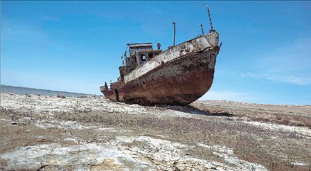 Εκεί που παίζουν οι μικροί κοζάκοι μαθητές, στη σκιά των προσαραγμένων στην τοξική λάσπη καραβιών, βρισκόταν έως πριν από μερικές δεκαετίες το λιμάνι Αράλσκ, το μεγαλύτερο της λίμνης Αράλης. Η υπερβολική άρδευση και η βιομηχανική ρύπανση έκαναν πραγματικότητα έναν οικολογικό εφιάλτη. Σήμερα μόλις το 10% της παλαιάς έκτασης της Αράλης καλύπτεται από νερό. Ενα νέο φράγμα ίσως ξανακάνει το Αράλσκ… λιμάνι: η πόλη απείχε ως και 100 χιλιόμετρα από το νερό, αλλά σιγά σιγά η λίμνη «επιστρέφει», ευρισκόμενη τώρα στα 15-20 χιλιό μετρα, ανάλογα με τις βροχές. (ΑΡ/SΕRGΕΥ ΡΟΝΟΜΑRΕV)