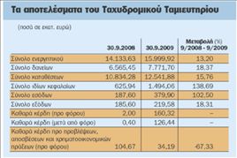 Σημαντική αύξηση, η οποία προήλθε στον μεγαλύτερο βαθμό της από την άνοδο των εσόδων από χρηματοοικονομικές πράξεις, σημείωσαν τα κέρδη του Ταχυδρομικού Ταμιευτηρίου στο εννεάμηνο του 2009. Σε ενοποιημένη βάση, τα καθαρά κέρδη μετά τους φόρους ανήλθαν σε 126,44 εκατ. ευρώ από 0,4 εκατ. ευρώ την αντίστοιχη περυσινή περίοδο. Το ίδιο διάστημα τα κέρδη προ φόρων έφθασαν τα 160,32 εκατ. ευρώ έναντι κερδών 2 εκατ. ευρώ, ενώ τα προ φόρων κέρδη του γ΄ τριμήνου ανήλθαν στο ποσό των 37,39 εκατ. ευρώ έναντι 9,81 εκατ. ευρώ το 2008.