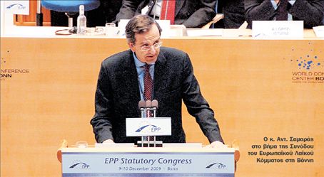 Ο κ. Σαμαράς μιλώντας στη Σύνοδο του ΕΛΚ, υπερασπιζόμενος τον «κοινωνικό φιλελευθερισμό», αναφέρθηκε σε ένα μη «γραφειοκρατικό εθνικό κράτος δικαίου, στα πλαίσια μιας μη γραφειοκρατικής Ευρωπαϊκής Ενωσης». Στις, δε, συζητήσεις που είχε με ομοϊδεάτες του πολιτικούς αρχηγούς άλλων ευρωπαϊκών κεντροδεξιών κομμάτων επιχείρησε να στηρίξει την εικόνα της εθνικής οικονομίας και να μετριάσει τις αρνητικές εντυπώσεις.