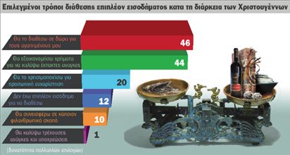 Μεταξύ εκείνων που δηλώνουν ότι θα ταξιδέψουν, η πλειονότητα των οποίων ανήκει στις νεότερες ηλικίες, το 59% αναφέρει ότι θα ταξιδέψει εντός Ελλάδας και η διαμονή του θα είναι κυρίως σε δικό του σπίτι (εξοχικό/πατρικό), ενώ το υπόλοιπο 41% θα ταξιδέψει στο εξωτερικό. Οσον αφορά τις μεγαλύτερες ηλικίες, οι 35-44 ετών προτιμούν να μείνουν σε φιλικό σπίτι/ ξενοδοχείο, ενώ οι άνω των 45 δηλώνουν ότι θα μείνουν σε δικό τους σπίτι (εξοχικό/ πατρικό). Από την άλλη, σχεδόν πέντε στους δέκα Ελληνες θα διαθέσουν το επιπλέον εισόδημά τους για να αγοράσουν δώρα για τους αγαπημένους τους ανθρώπους. Παράλληλα, τέσσερις στους δέκα θα εξοικονομήσουν χρήματα για να καλύψουν τυχόν έκτακτες ανάγκες. Επιπλέον, ένας στους τέσσερις θα χρησιμοποιήσει το επιπλέον εισόδημα για προσωπική ευχαρίστηση και διασκέδαση, ενώ μόνο ένας στους δέκα θα συνεισφέρει σε κάποιον φιλανθρωπικό σκοπό. Οσον αφορά το πού σκοπεύουν να διαθέσουν το επιπλέον εισόδημά τους, οι νεαρότερες ηλικίες επιλέγουν την προσωπική τους ευχαρίστηση, ενώ οι παραγωγικές ηλικίες των 35+, πιθανά και λόγω αυξημένων υποχρεώσεων, υιοθετούν πιο συντηρητική στάση εξοικονόμησης χρημάτων.