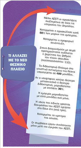 Συγκεκριμένα, όπως αναφέρεται στον οδηγό, με το νέο θεσμικό πλαίσιο επανακαθορίζονται οι φορείς του δημόσιου τομέα οι οποίοι προσλαμβάνουν προσωπικό με διαδικασίες μέσω ΑΣΕΠ, καθώς σε αυτές υπάγονται όλες ανεξαιρέτως υπηρεσίες του Δημοσίου, το προσωπικό των νομικών προσώπων της Εκκλησίας, με την προϋπόθεση ότι επιβαρύνει τον κρατικό προϋπολογισμό, και οι ΔΕΚΟ που είχαν εξαιρεθεί με τον «νόμο Αλογοσκούφη».