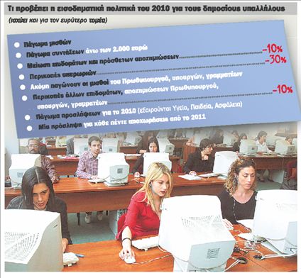 «Πάγωμα» μισθών για τους δημοσίους υπαλλήλους και τους υπαλλήλους του ευρύτερου δημόσιου τομέα, περικοπές κατά μέσο όρο 10% στα επιδόματά τους και τις πρόσθετες αποζημιώσεις και μείωση του ορίου υπερωριών κατά 30% προβλέπει η εισοδηματική πολιτική της κυβέρνησης για το 2010 την οποία ανακοίνωσε χθες το βράδυ ο υπουργός Οικονομικών κ. Γ. Παπακωνσταντίνου . Ταυτόχρονα «παγώνουν» οι συντάξεις για ποσά άνω των 2.000 ευρώ και χορηγείται μόνο αύξηση 1,5% για τις συντάξεις έως 2.000 ευρώ.