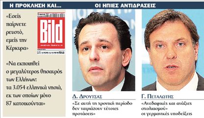 «Θεωρώ ότι στην παρούσα χρονική στιγμή πρέπει να επικεντρώσουμε την προσοχή μας στο ότι η Ελλάδα και η ελληνική κυβέρνηση κατέθεσαν ένα πραγματικά σοβαρό πρόγραμμα λιτότητας. Σε αυτή τη χρονική περίοδο δεν ταιριάζουν τέτοιες προτάσεις. Αυτό που χρειαζόμαστε είναι η έκφραση αλληλεγγύης από όλους τους εταίρους στην ΕΕ» ήταν η δήλωση του κ. Δρούτσα στη γερμανική δημόσια τηλεόραση ΑRD όταν εκλήθη να σχολιάσει το δημοσίευμα της «Βild». Η «προβοκατόρικη» υπόδειξη της «Βild» ήταν πάντως ξεκάθαρη: «Πουλήστε τα νησιά σας, χρεοκόποι Ελληνες» ήταν ο τίτλος χθεσινού άρθρου της. Και ο υπότιτλος: «… μαζί τους και την Ακρόπολη ». Δίπλα, μια φωτογραφία του Παρθενώνα με τη λεζάντα: «Εκτιμώμενη αξία:100 δισ.ευρώ» . Η εφημερίδα δεν διευκρινίζει από πού προέρχεται αυτή η εκτίμηση. Εκείνο για το οποίο είναι όμως σίγουρη είναι ότι τα μέτρα που εξήγγειλε την Τετάρτη ο κ. Παπανδρέου αποτελούν «σταγόνα στον ωκεανό». Το συμπέρασμά της: Αν οι Γερμανοί πρέπει να δώσουν βοήθεια στους Ελληνες, τότε πρέπει και οι Ελληνες να κάνουν κάτι για τους Γερμανούς, ήτοι, για παράδειγμα, να τους παραδώσουν «μερικά από τα πανέμορφα νησιά τους στο Αιγαίο. Το μότο:Εσείς παίρνετε ρευστό, εμείς την Κέρκυρα». Το ότι το νησί των Φαιάκων δεν βρίσκεται στο Αιγαίο, δεν έχει εδώ πολλή σημασία. Το βασικό είναι να αρχίσει επιτέλους η εκποίηση του, όπως γράφει η ίδια, «μεγαλύτερου θησαυρού των Ελλήνων: των 3.054 ελληνικών νησιών, εκ των οποίων μόνο 87 κατοικούνται». Ε να δείγμα γι΄ αυτό, σημειώνει, υπάρχει ήδη: Το μεσιτικό γραφείο του Αμβούργου Vladi Ρrivate Ιslands έβγαλε πρόσφατα στο σφυρί ένα ακατοίκητο ελληνικό νησί με τιμή εκκίνησης τα 45 εκατ. ευρώ. Ο αρθρογράφος αποφεύγει να πει αν πρέπει να βγουν στον πλειστηριασμό και τα κατοικημένα, διατυπώνει όμως ένα «μεγάλο» ερώτημα: «Μήπως η καγκελάριος θα θέσει το θέμα των νησιών και κατά την αυριανή συνομιλία της με τον ομόλογό της Παπανδρέου;».