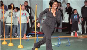 ΣΕ ΜΙΑ ΑΣΥΝΗΘΙΣΤΗ για πρώτη κυρία πόζα συνέλαβε ο φωτογραφικός φακός τη Μισέλ Ομπάμα, σύζυγο του προέδρου των ΗΠΑ. Φορώντας τη φόρμα της και χαμογελαστή τρέχει ελισσόμενη ανάμεσα στα εμπόδια που έχουν τοποθετηθεί σε κέντρο άσκησης για παιδιά στην Ουάσιγκτον. Η κυρία Ομπάμα μετέχει σε εκστρατεία για τη βελτίωση της φυσικής κατάστασης και την καταπολέμηση της παχυσαρκίας στα παιδιά.