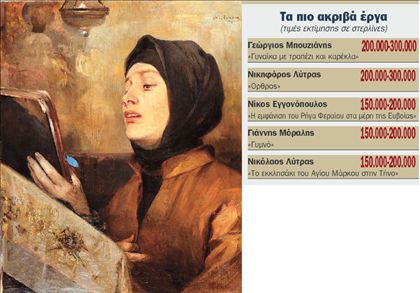 «Είμαστε αισιόδοξοι και προσπαθούμε να κρατήσουμε τις τιμές όσο γίνεται πιο χαμηλά» αναφέρει η Τερψιχόρη Αγγελοπούλου, υπεύθυνη της εταιρείας εικαστικών συμβούλων Αrt Εxpertise, η οποία συνεργάζεται με τον οίκο. Τα δύο ακριβότερα έργα της δημοπρασίας (τιμή εκτίμησης 200.000-300.000 στερλίνες) έχουν τις υπογραφές του Γεωργίου Μπουζιάνη και του Νικηφόρου Λύτρα, ενώ ακολουθούν (τιμή εκτίμησης 150.000-200.000 στερλίνες) πίνακες των Νίκου Εγγονόπουλου , Γιάννη Μόραλη, καθώς και «Το εκκλησάκι του Αγίου Μάρκου στην Τήνο» του Λύτρα, πίνακας που είχε επιλεγεί από την Εθνική Πινακοθήκη ως αφίσα για την αναδρομική έκθεση του καλλιτέχνη το 2008. Στη δημοπρασία περιλαμβάνονται επίσης αξιόλογα γλυπτά των Κώστα Κουλεντιανού, Κλέαρχου Λουκόπουλου, Φιλόλαου, Γιώργου Ζογγολόπουλου κ.ά. Οι πίνακες και τα γλυπτά θα εκτεθούν πριν από τη δημοπρασία στον πολυχώρο πολιτισμού «Αθηναΐς».