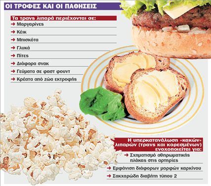 Τα επικίνδυνα για την υγεία τρανς λιπαρά πρέπει να απαγορευτούν. Ελληνες και ξένοι επιστήμονες συμφωνούν ότι τα προϊόντα που περιέχουν αυτά τα ανθυγιεινά υδρογονωμένα φυτικά έλαια πρέπει να «εξοριστούν» από την αγορά. Ηδη στη Νέα Υόρκη, στην Καλιφόρνια, στην Ελβετία, στη Δανία και στην Αυστρία έχουν απομακρυνθεί από τα ράφια και απαγορεύονται. «Στην Ελλάδα δεν υπάρχει ενδιαφέρον να τεθούν περιορισμοίστην κατανάλωση των κακών λιπαρών, τρανς και κορεσμένων» λέει ο καθηγητής Προληπτικής Ιατρικής και Διατροφής του Πανεπιστημίου Κρήτης κ. Α. Καφάτος .